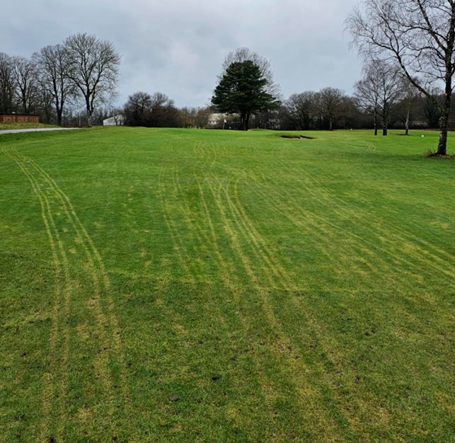 Det nederste billede er fra korthulsbanen, hvor man kan se brune spor i græsset, efter færdsel på frossent græs.