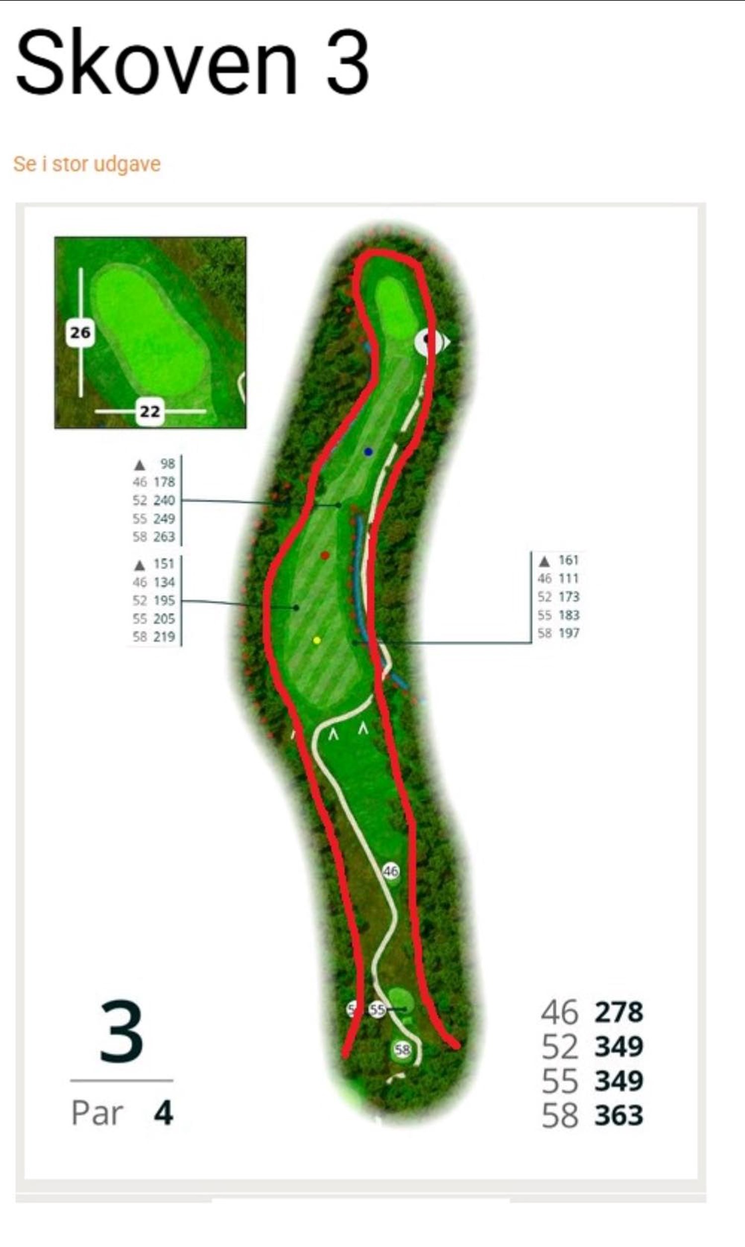 Klubben har for at lette spillet og øge spilletempo, valgt at udvide straf området på Skoven 3 til at strække sig hele vejen fra tee til green på begge sider af hullet som det kan ses på det nye kort over hullet.