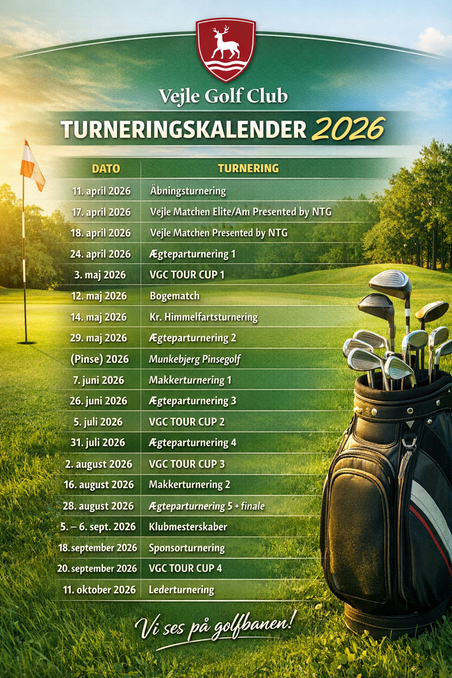 Vi lægger ud med Åbningsturneringen LØRDAG DEN 11. APRIL. Grundet mange konfirmationer i begyndelsen af april, starter vi 2026 sæsonen på en lørdag. Tilmelding er åben. Åbningsturneringen starter med fælles morgenmad i klubhuset inden runden og her sidder spillerne sammen med den flight de skal spille i.
